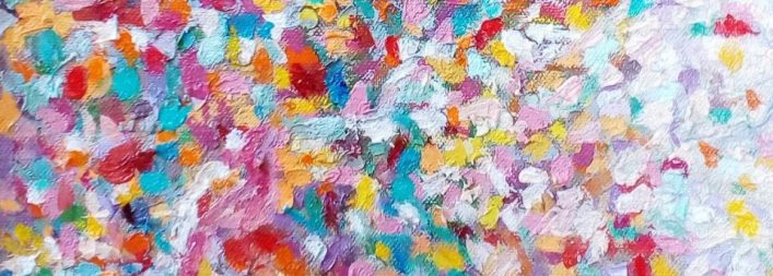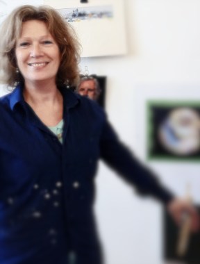 Her oil paintings are a bold, colourful style, incorporating aspects of abstraction.