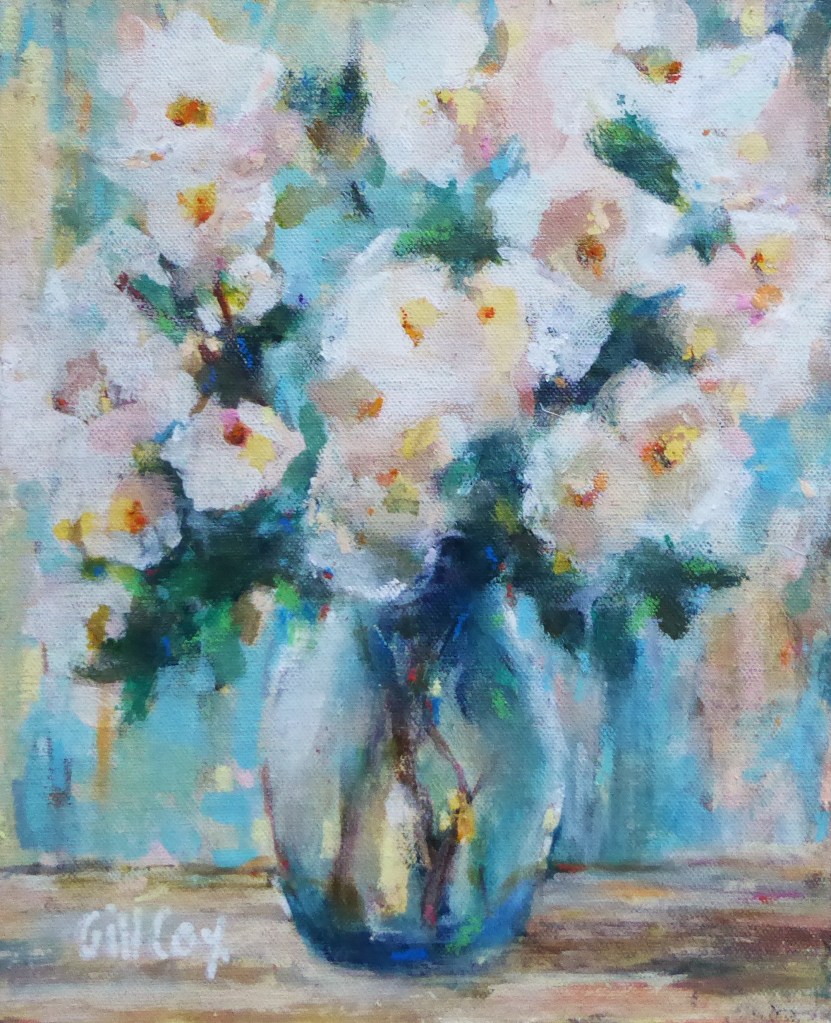 7 pots and yellow flower display, oil on canvas panel 50cms by 40cms £475